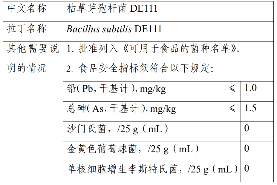 枯草芽孢杆菌已被列入欧洲食品安 全局资格认定(QPS)名单的推荐生物制剂列表以及国际乳品联合会公报(Bulletin of the IDF 514/2022)的“在发酵食品中证明安全的微生物品种目录”,并在美国、加拿大、澳大利亚、新西兰、日本、韩国等多个国家和地区批准为可直接食用的菌种。其中枯草芽孢杆菌 DE111 菌株在美国获得 GRAS 认证,在澳大利亚和新西兰已备案一般健康申称的记录。