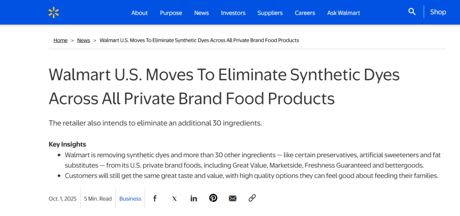 1.Walmart U.S. Moves To Eliminate Synthetic Dyes Across All Private Brand Food Products