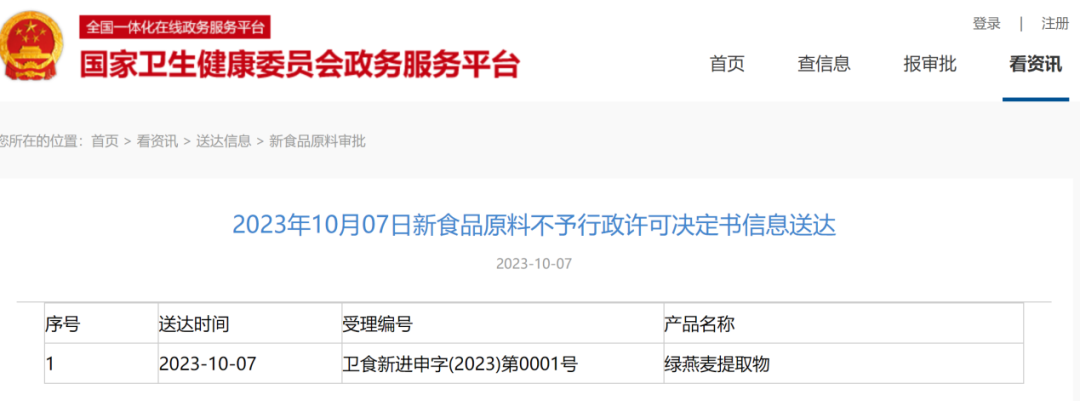 10月7日,国家卫健委发布绿燕麦提取物申报新食品原料不予行政许可的通告。