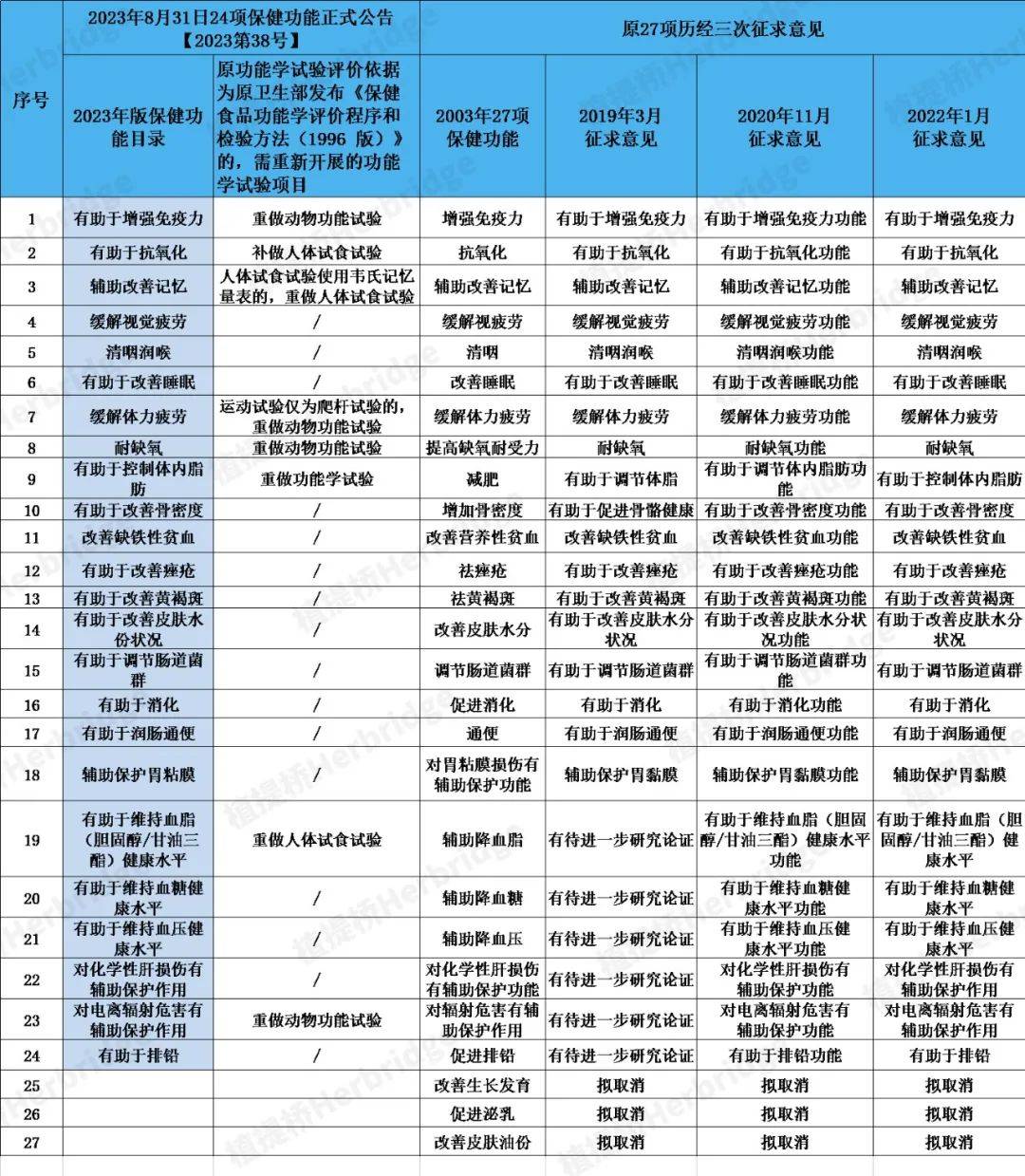 此次文件最为核心的部分,就是将27项保健功能调整为24项,直接删除了“改善生长发育”“促进泌乳”“改善皮肤油分”3种共识程度不高、健康需求不明晰的保健功能。