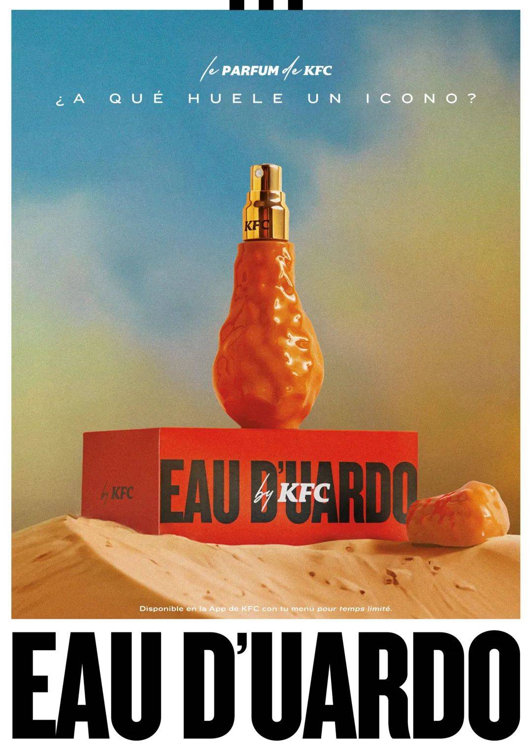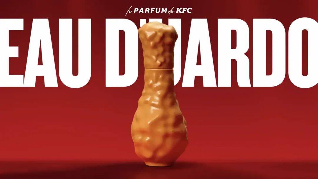 圣诞前夕,西班牙肯德基推出了中性香水Eau D’uardo,它的味道灵感来自肯德基炸鸡的原始配方。香水瓶是一个经典的鸡腿形状,香水中有新鲜天竺葵、柑橘、胡椒、佛手柑味[1]。