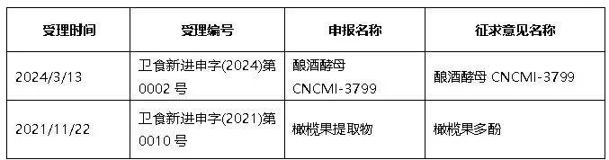 经植提桥查阅,橄榄果提取物、酿酒酵母CNCMI-3799分别在2021年和2024年申报的新食品原料被受理,期间经过延期,现终于开始征求意见,距离审批通过就一步之遥。