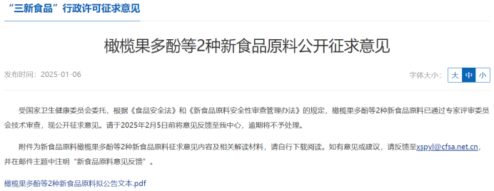 新年第一周,有2种“三新原料”申报受理,同时又有2种新食品原料公开征求意见,分别是橄榄果多酚、酿酒酵母CNCMI-3799。