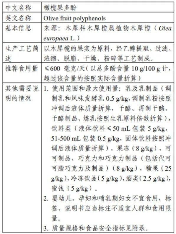 橄榄果多酚在美国被作为“一般认为安全的物质(GRAS)”管理。推荐食用量为≤600 毫克/天(以总多酚含量10.0 g/100g计,超过该含量的按照实际含量折算)。