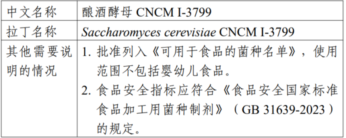 酿酒酵母已被列入欧洲食品安全局资格认定(QPS)名单的推荐微生物列表和国际乳品联合会公报(Bulletin of the IDF 514/2022)的“在发酵食品中证明安26全的微生物品种目录”,以及丹麦的《食品中使用的微生物菌种名单记录》。本次批准列入《可用于食品的菌种名单》,使用范围不包括婴幼儿食品。
