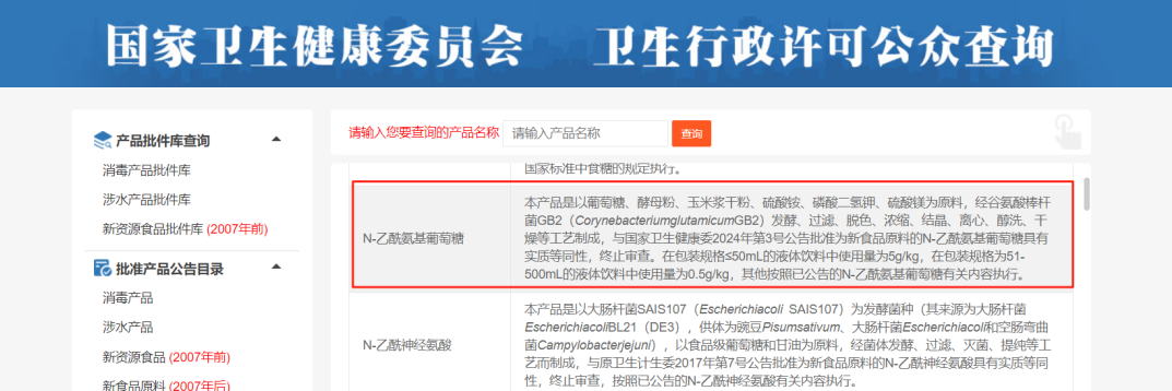 审查意见:本产品是以葡萄糖、酵母粉、玉米浆干粉、硫酸铵、磷酸二氢钾、硫酸镁为原料,经谷氨酸棒杆菌GB2(CorynebacteriumglutamicumGB2)发酵、过滤、脱色、浓缩、结晶、离心、醇洗、干燥等工艺制成,与国家卫生健康委2024年第3号公告批准为新食品原料的N-乙酰氨基葡萄糖具有实质等同性,终止审查。在包装规格≤50mL的液体饮料中使用量为5g/kg,在包装规格为51-500mL的液体饮料中使用量为0.5g/kg,其他按照已公告的N-乙酰氨基葡萄糖有关内容执行。