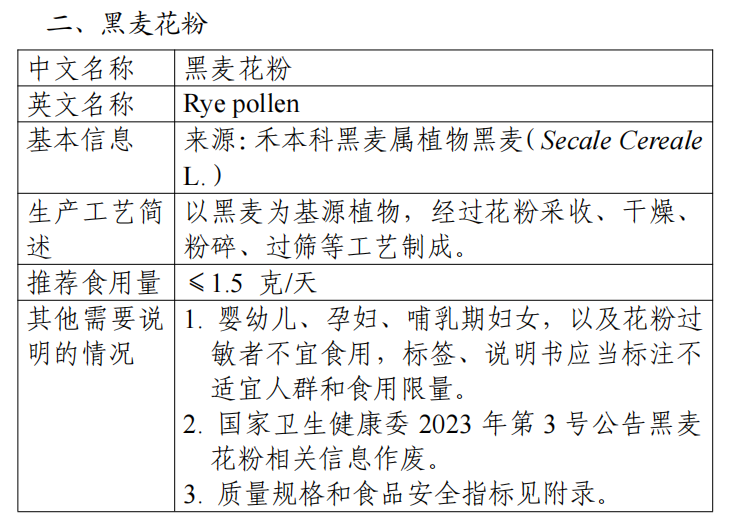在我国,国家卫生健康委发布的2023年第3号公告已经批准黑麦花粉为新食品原料,本次公告调整了膳食纤维的含量要求。即基于行业发展需求和新数据论证,现将原公告中膳食纤维的含量为≥50g,现在要求修订为≥30g/100g并重新公告。