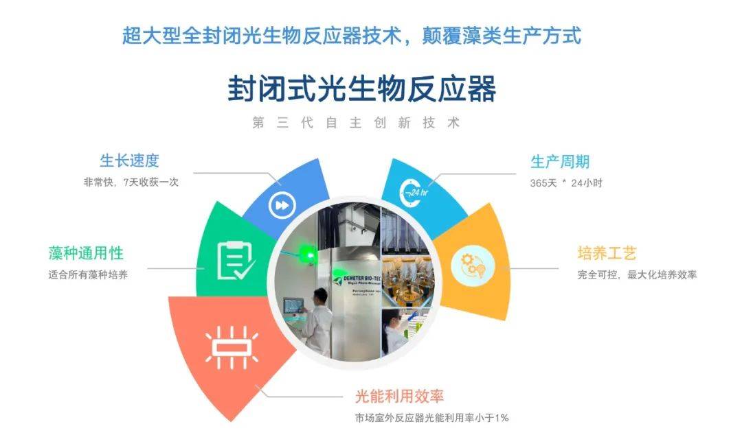 生产阶段,德默特研发出了独特的生产方式——工厂化藻类培养,将藻类培养搬进了工厂当中,通过自助研发的超大型封闭式光生物反应器,以及核心工艺光配方、碳配方来培养藻类,区别于传统管道式的藻类培养。