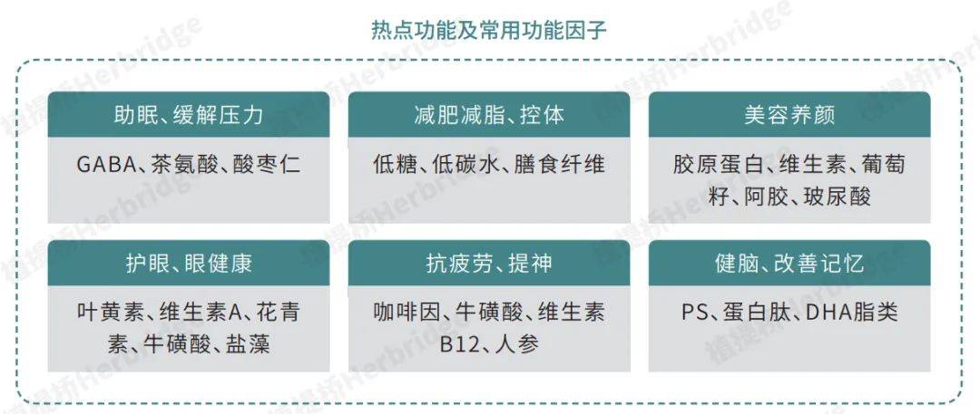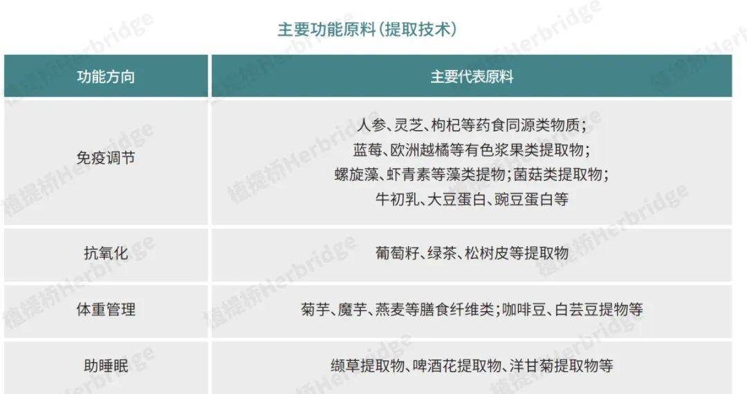 全球功能性产品原料主要以维生素、矿物质、蛋白质、胶原蛋白、益生菌、益生元等传统原料为主,植物草本原料会成为新的趋势,而国内的功能性食品会关注“新食品原料和药食同源”等新兴原料。