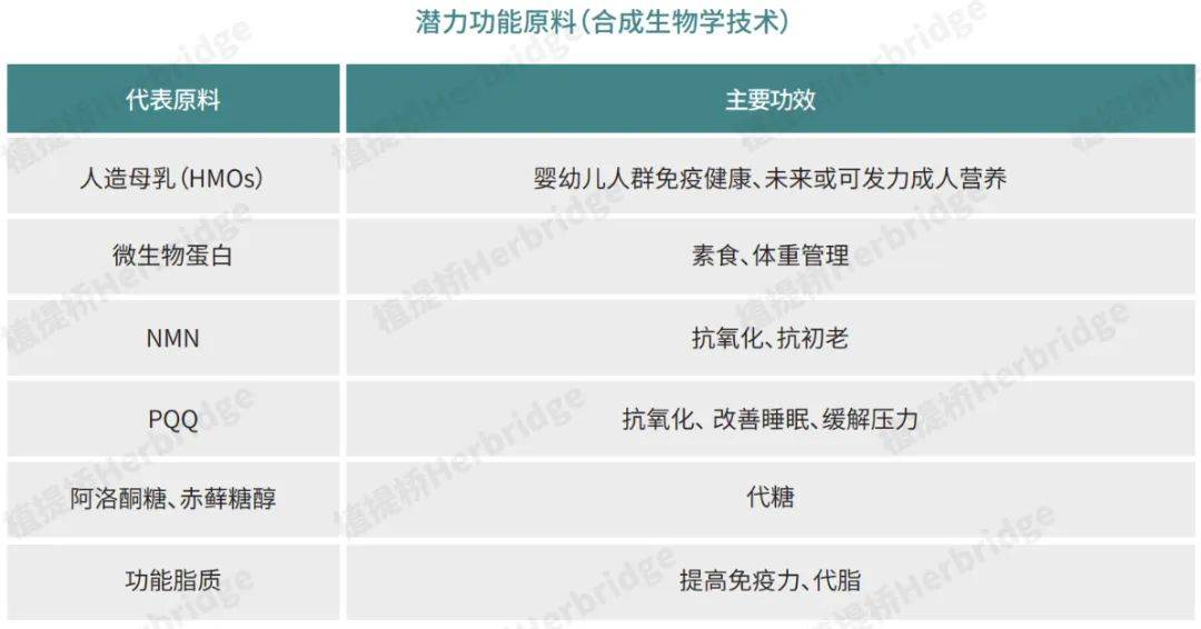 合成生物技术已成为功能食品产业链上游创新的源泉,很多功能原料正试图用合成生物技术来开发生产,如人造母乳、替代蛋白、功能代糖(莱鲍迪甙)、合成红景天苷等。