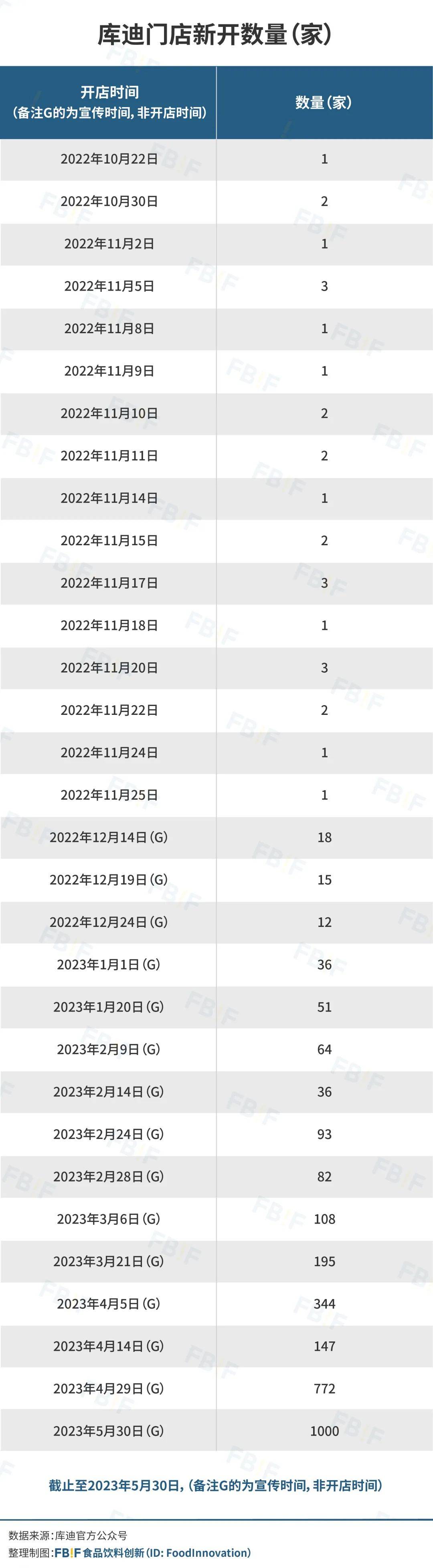2023年2月14日,库迪在推文中宣布“百城千店”。自首店IFC福州国际金融中心店开业算,4个多月,1000家门店,平均每月新增220家以上。4月29日,重庆九龙坡万象里店开业,这是库迪的第2000家门店开业;5月30日,北京国贸3期b座店开业,这是库迪的第3000家门店;6月30日,库迪咖啡全国门店数达到4000家。这一期间,平均每个月新增1000家门店,也就每天都有33家库迪新店开业。