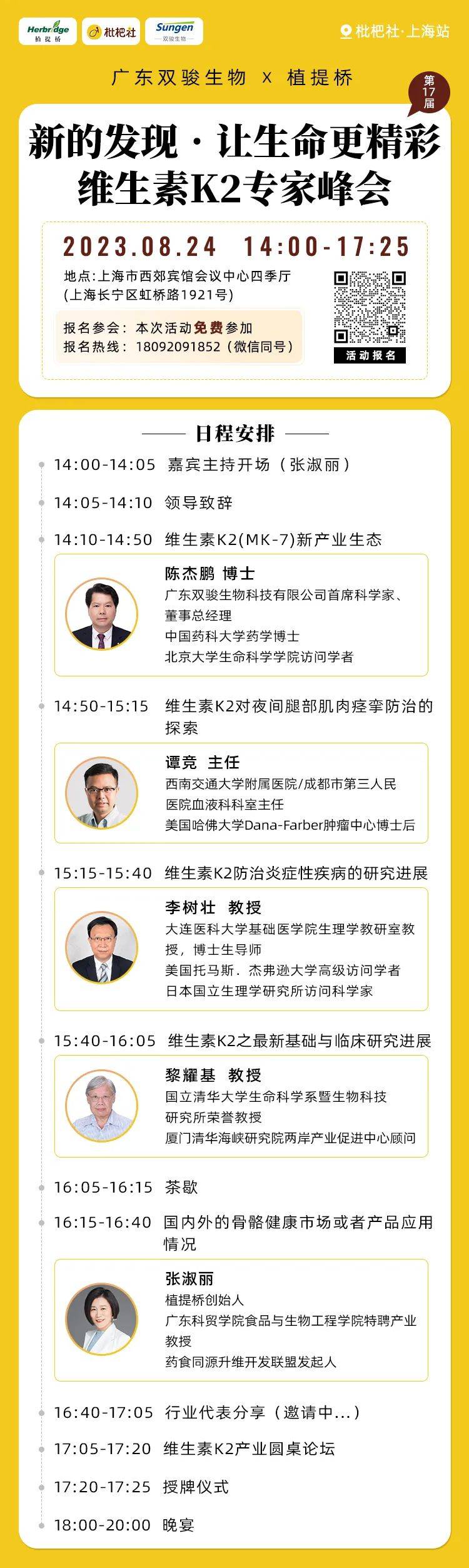 随着更多维生素K2健康证据的发现与产品的转化应用,全球维生素K2产业正处于快速发展阶段。为持续推动维生素K2产业的发展,由广东双骏生物科技有限公司与植提桥联合主办的“新的发现·让生命更精彩——维生素 K2 专家峰会”。