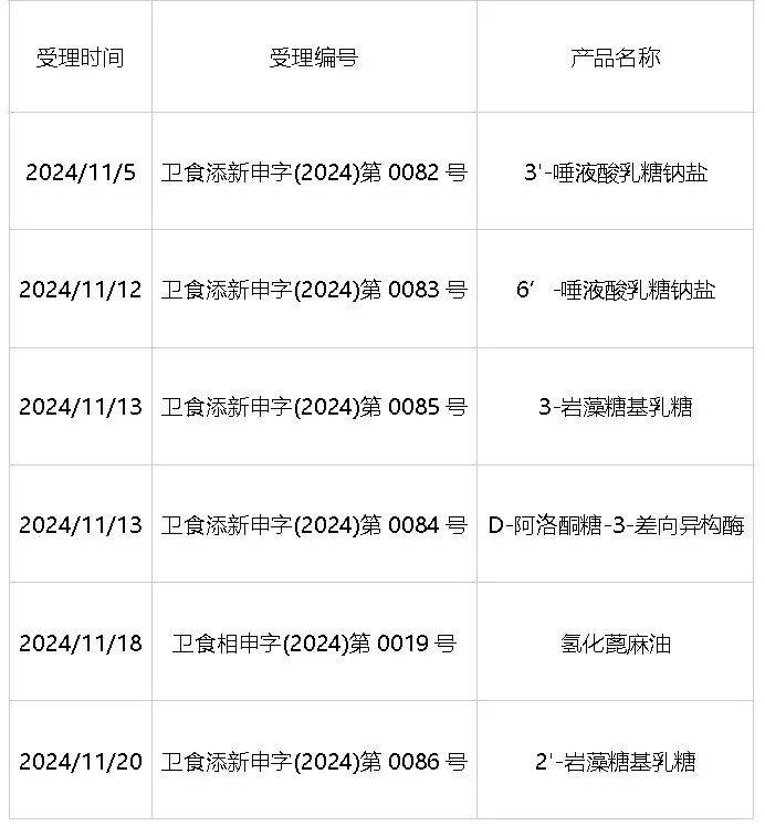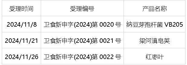 刚刚过去的11月,卫健委官网,有多款三新原料被受理 ,如纳豆芽孢杆菌VB205、梁河滇皂荚 、红枣叶、4款HMO等,同时有2款食品添加剂的审批被驳回,不予许可。