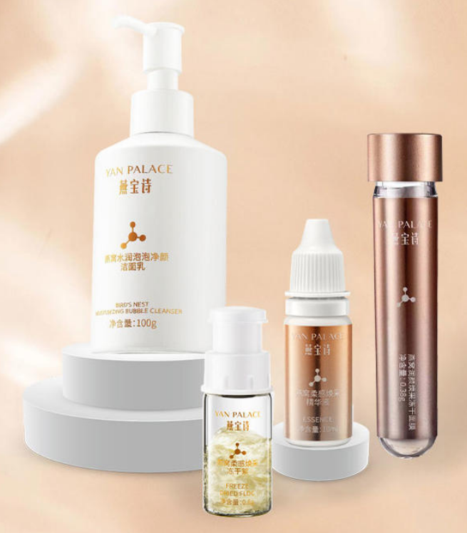 此外,燕之屋也推出了面向化妆品市场的子品牌——YAN PALACE燕宝诗,并推出了系列新品,包括燕窝柔感焕采冻干絮精华液、燕窝润颜焕彩冻干面膜、燕窝水润泡泡净颜洁面乳以及燕窝润颜洁面湿巾等多款护肤品新品。