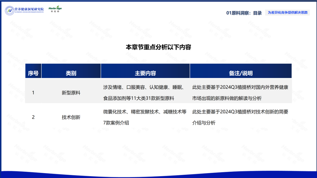 2024 Q3季度营养健康产业扫描中,共计收录11大类31款新型原料,涉及情绪、口服美容、认知健康、睡眠、食品添加剂等,从这些原料可以看出如下趋势: