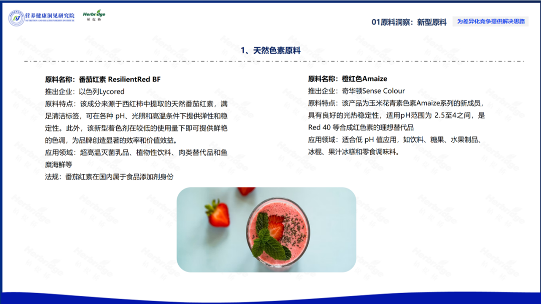 随着消费者对天然和绿色偏好的日益增加,企业端对天然植物来源的健康原料也愈发关注,像奇华顿、泰莱、Lycored、GNT等企业都有在第三季度推出天然来源的原料。涉及天然色素、甜味剂、功能原料等多种方向。