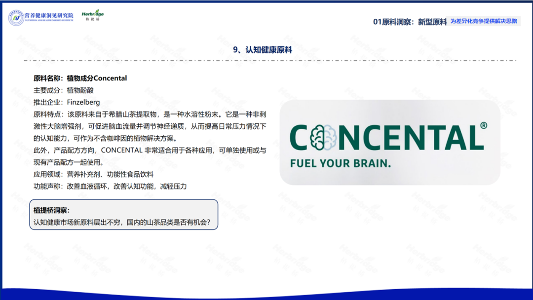 国外企业Finzelberg在本季度推出了一款来自希腊山茶的提取物Concental,面向认知健康方向,可作为不含咖啡因的植物解决方案。在具体的应用方面,无论独立使用还是加入现有产品配方都是可以的,且在胶囊、片剂、软胶囊、软糖、速溶粉、泡腾片等各种产品中都可应用。