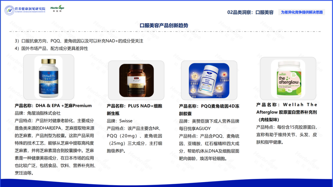 近年来,随着合成生物学、发酵技术等的进步,麦角硫因,PQQ,NAD+等成分能够以更加优惠的价格为口服美容产品的差异化创新服务。在本季度,Swisse、美赞臣都推出添加相关成分的产品。