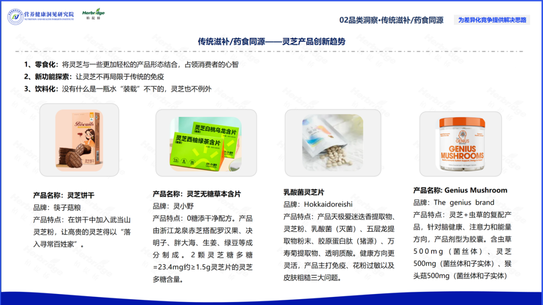 以灵芝为例,它被开发成了饼干、糖果、饮料等多种形式的产品。其中筷子菇粮通过在饼干中加入灵芝粉,让高贵的灵芝得以“落入寻常百姓家”。健康科技品牌灵小野则将灵芝与糖果做了结合,推出灵芝无糖草本含片。正官庄将灵芝与红参搭配推出EVERYTIME红参灵芝饮品,使用现代技术将原料的营养浓缩至小小一条液体,省去传统滋补长时间的煎煮过程。
