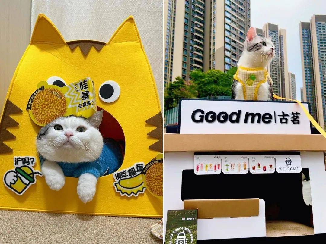 同样,古茗也推出了广东限定猫窝,奶茶屋的造型被不少网友种草,很多网友晒图分享“自家小猫当上了古茗猫店长”。