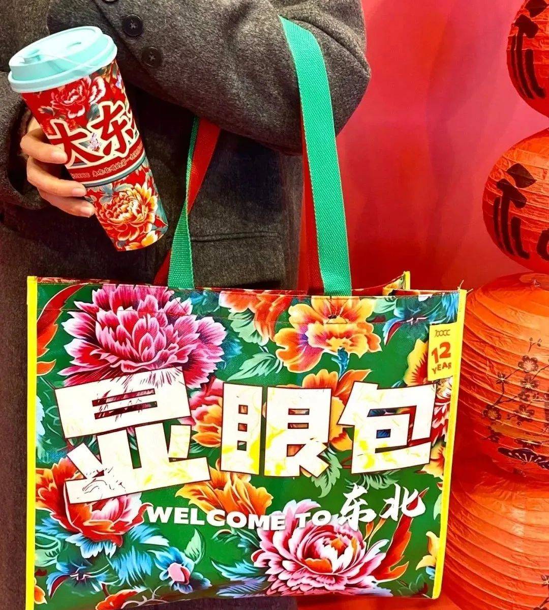 比如,东北茶饮品牌700CC天然苏打水鲜果茶,前段时间推出了东北大花限定款显眼包,超大号的挎包东北味十足,成为不少年轻人Citywalk时最扎眼的装备。最近限定东北大花杯也将上线。