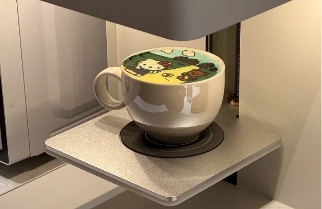 打印咖啡,也叫印花咖啡,顾名思义就是通过3D咖啡打印机、可食用色素定制拉花。顾客可选择想要的图案,仅需数秒,喷口就能在咖啡顶部精准“绘制”一幅精致图案。