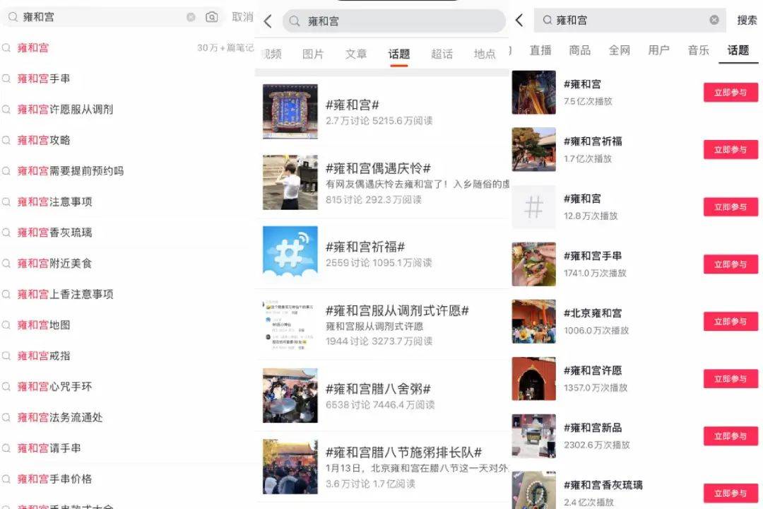 其中,当属雍和宫最红,几乎成为拜佛顶流。根据魔镜市场情报的数据,近3个月来,在微博、抖音、小红书平台,与雍和宫相关的发帖声量超22万篇,而其中有超20%的帖子都提到了雍和宫手串。