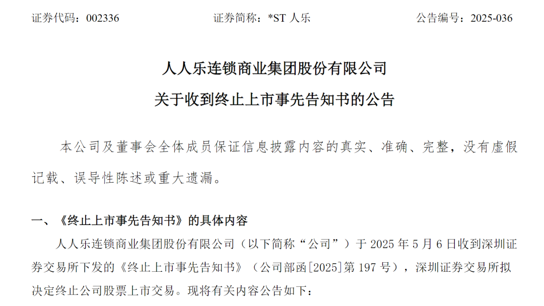据人人乐公告显示,人人乐(以下简称“公司”)于2025年5月6日收到深圳证券交易所下发的《终止上市事先告知书》(公司部函[2025]第197号),深圳证券交易所拟决定终止公司股票上市交易。现将有关内容公告如下:
