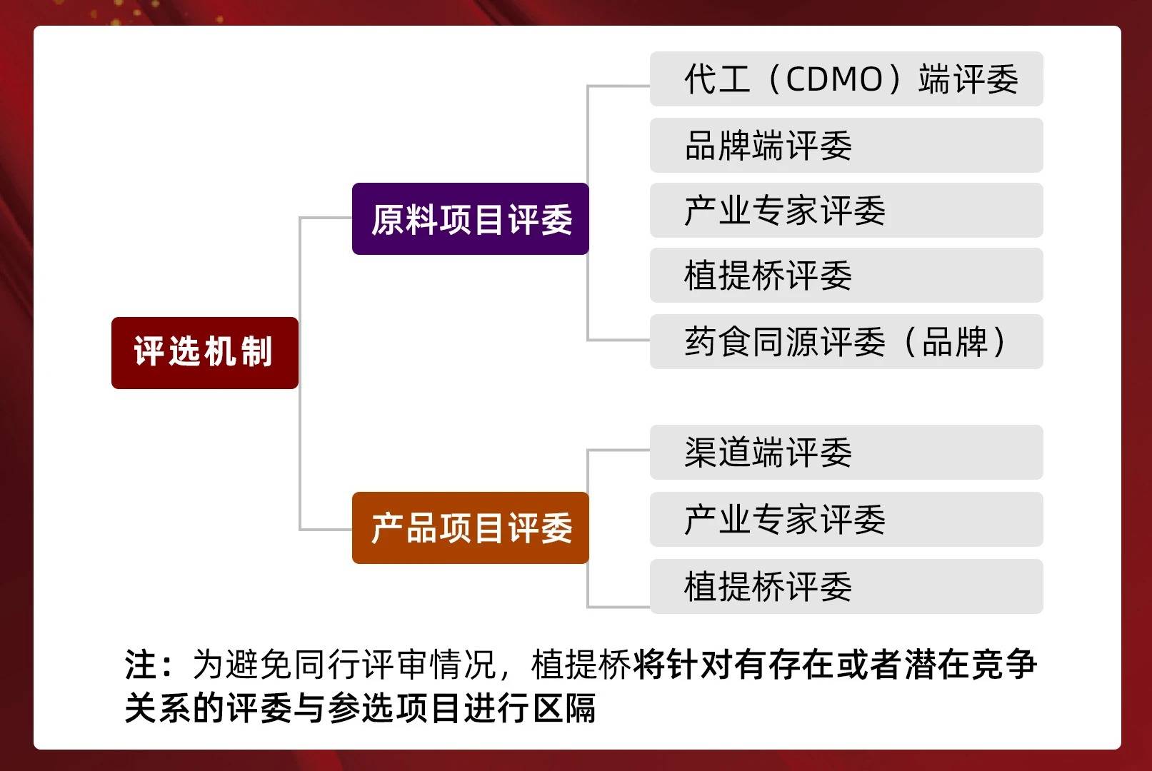 评委包括品牌端评委、CDMO端评委、药食同源评委、渠道端评委、产业专家评委、植提桥评委,6大类型评委;不同领域的头部企业专家代表,他们以多元化的视角和丰富的行业经验,为赛事的评审工作提供坚实保障。