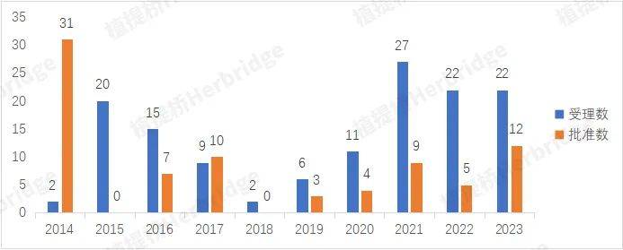 纵观2014-2023年新食品原料受理和审批的动态,从2021年开始,新食品原料的受理数明显增多,获批速度也明显加快。从2014-2023年共受理136个,批准81个新食品原料。