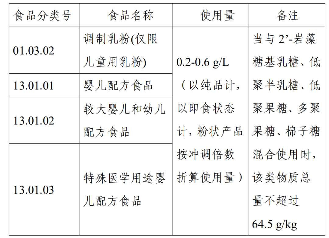 乳糖-N-新四糖(LNnT)为母乳中另一种高含量母乳低聚糖HMO,批准作为食品营养强化剂新品种,允许用于婴幼儿配方食品等食品类别。