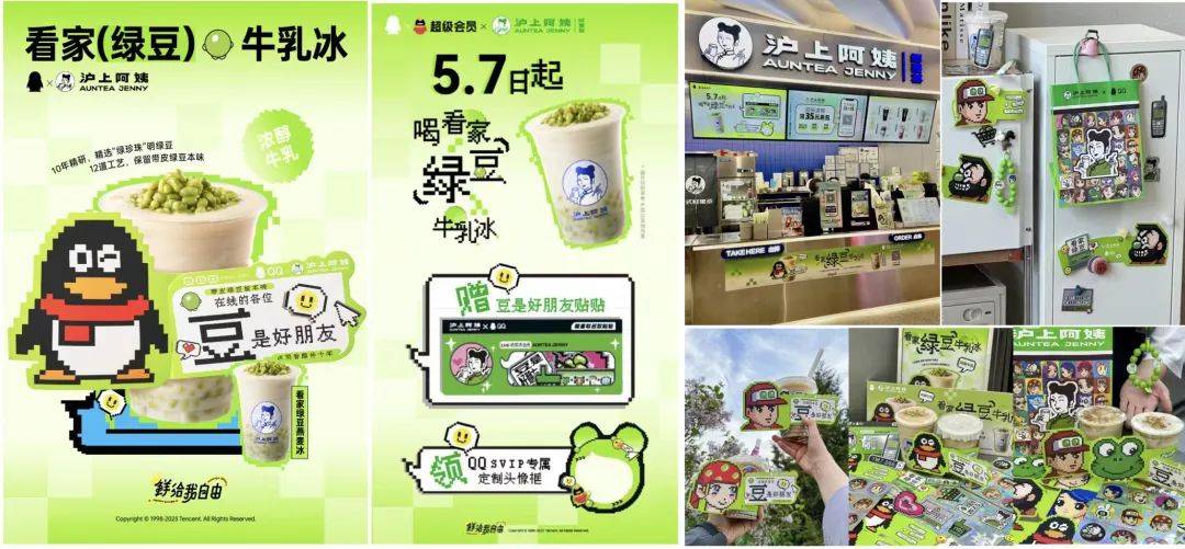 比如今年夏天,沪上阿姨经典产品绿豆牛乳冰回归,与QQ经典头像进行联名,推出“豆是好朋友”的主题活动。当童年记忆中的绿豆汤遇上QQ早期系统头像,这份双重怀旧组合让网友直呼“爷青回”。