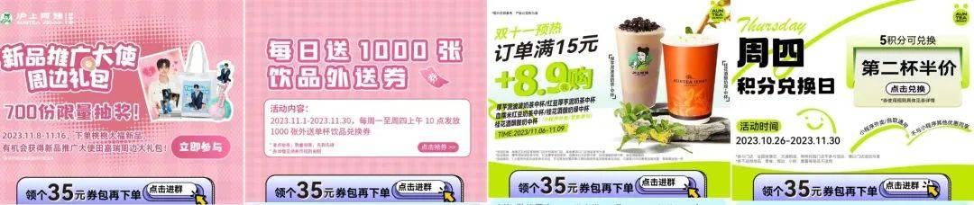与此同时,沪上阿姨还通过小程序、企业微信等渠道,向新老用户发放与之匹配的折扣券、代金券等,降低新用户首次消费门槛,同时为老会员提供新的购买欲,提高整体用户的转化率。