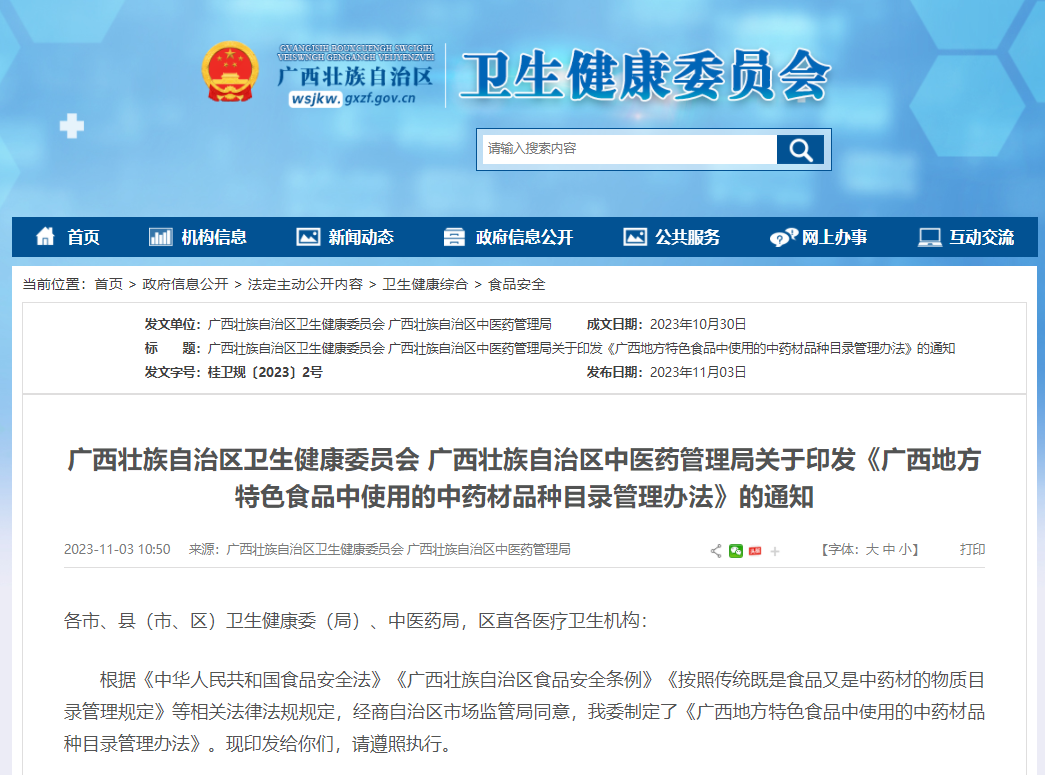 与此同时,在11月初,广西壮族自治区卫生健康委员会、广西壮族自治区中医药管理局关于印发《广西地方特色食品中使用的中药材品种目录管理办法》(以下简称“办法”)的通知。