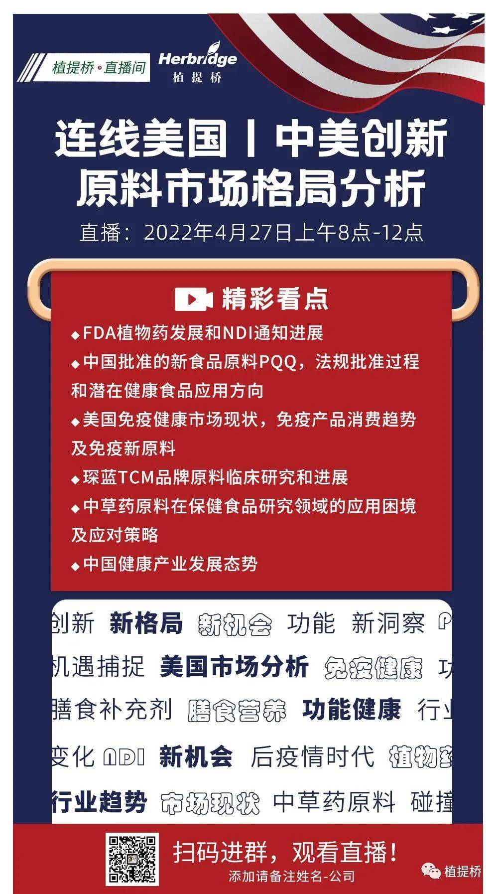 通过植提桥直播间渠道,以线上分享交流的方式,输出中美创新原料市场最新的动态趋势和专家大咖们的独家观点,希望能够给行业内外的从业者带来一些启发和思考。