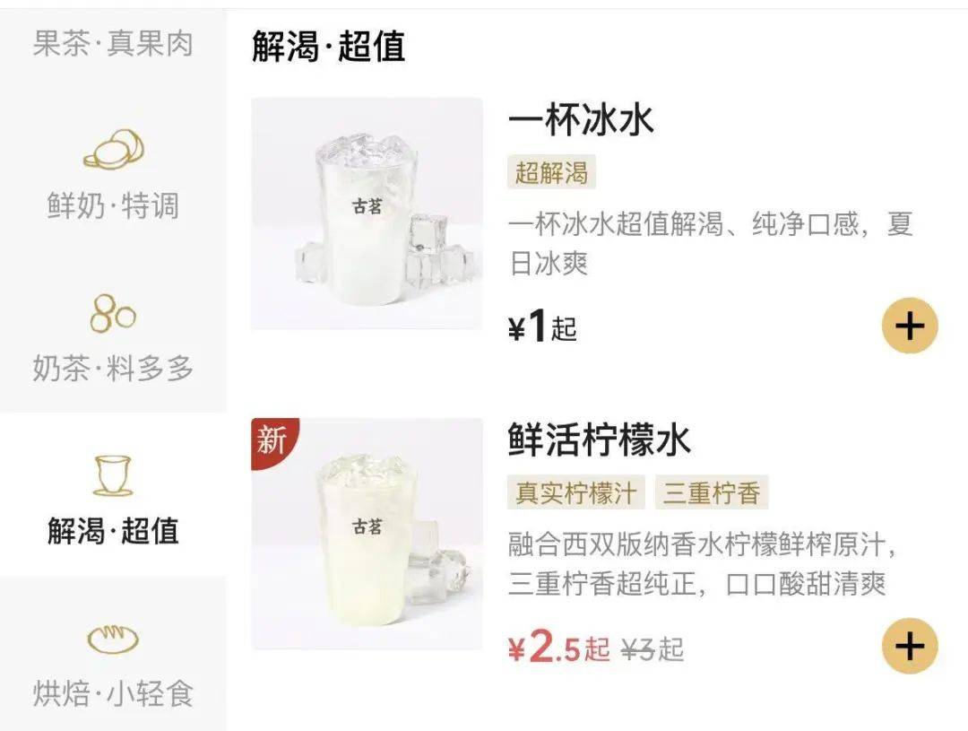今年古茗成功复刻,把1元冰水归属于“解渴·超值”类别,该类别还有另一个王炸单品——鲜活柠檬水,售价2.5元,融合西双版纳香水柠檬鲜榨原汁。
