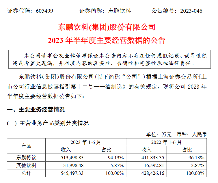 2023年9月21日下午,东鹏饮料(集团)股份有限公司(605499.SH,以下简称“东鹏饮料”)召开2023年半年度业绩说明会。根据其半年报报告披露,东鹏饮料取得营业收入54.6亿元,同比增长27.24%;净利润为11.08亿元,同比增长46.84%。