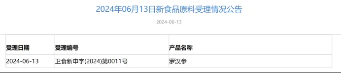 2个月前,罗汉参曾被受理申报一次;在2024/3/14卫食新申字(2024)第0004号就受理了罗汉参申报新食品原料,但在2024/4/2做了延迟通知。