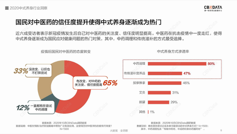 而据CBNData第一财经发布的《2020年中式养生行业洞察》报告显示,在此后的一年,近65%的消费者表示对中医药的关注度和信任度提高了。在中医药的“走红”和日益增长的健康需求下中式养身回归到人们的视野,中式滋补品也重获消费者的青睐。