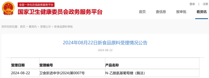 在卫健委2024年 第3号文件,刚批准N-乙酰氨基葡萄糖为新食品原料,其工艺描述是以葡萄糖、玉米浆干粉、硫酸铵、磷酸二氢钾、硫酸镁为原料,经谷氨酸棒杆菌 RDG-2110(Corynebacterium glutamicum RDG-2110)发酵、过滤、浓缩、结晶、离心、醇洗、干燥等工艺制成。N-乙酰氨基葡萄糖在骨骼健康、皮肤健康方面有一定的健康益处。