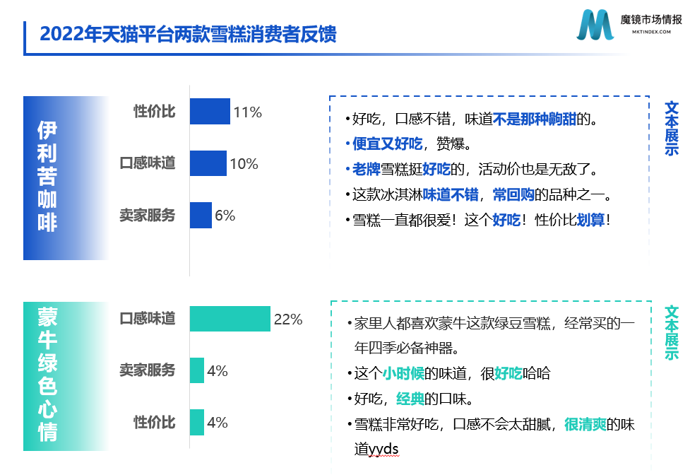 在新品迭出的雪糕市场,经典常青中也许就藏有消费的密码。以伊利苦咖啡和蒙牛绿色心情这两款雪糕为例,从天猫平台消费者反馈来看,不甜腻且受众广的口味和高性价比是消费者不断复购这两款雪糕的主要因素。而经典之下,除了产品的客观优势占领心智,不乏消费者的主观情绪驱使复购。电商评论中,不少消费者提及童年回忆、儿时味道等流露出怀旧情绪倾向的表达。