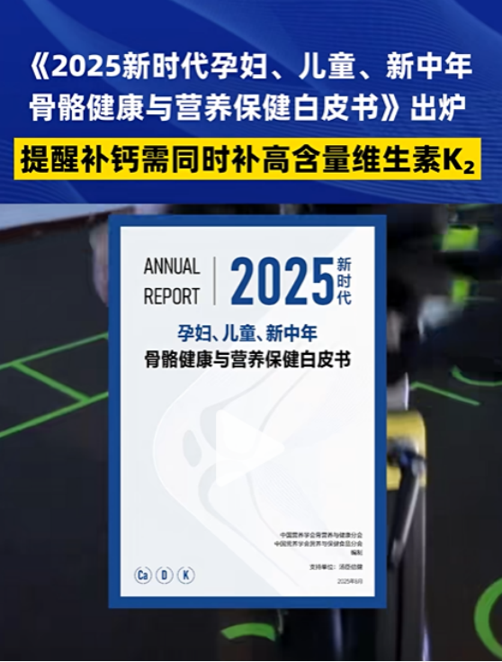 近期新华社视频号发布了一条“由中国营养学会编制、汤臣倍健为支持单位联合出版的《2025新时代孕妇、儿童、新中年骨骼健康与营养保健白皮书》”视频,该白皮书进一步明确了维生素K2在骨骼健康方面的功效、适用人群及推荐摄入量,为其科学价值提供了权威背书。