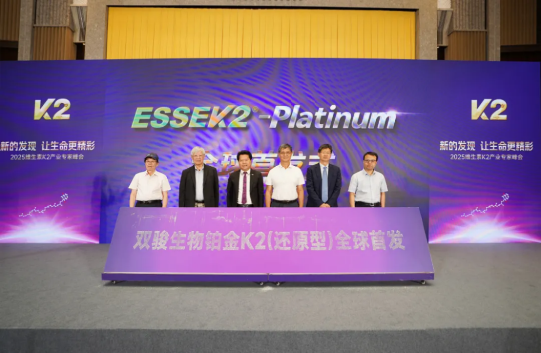 会上,双骏生物全球惊艳发布铂金K2(还原型)原料ESSEK2®-Platinum。这一战略级创新成果的发布,不仅是双骏生物科研创新实力的集中体现,更彰显了双骏生物在全球维生素K2产业的优势地位,是维生素K2产业向功能化升级的关键一步。