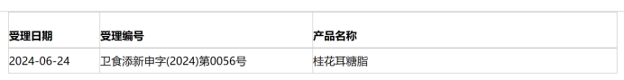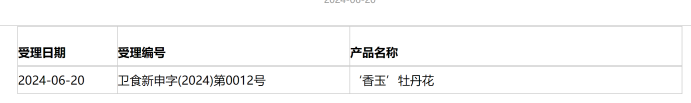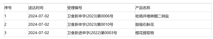 这3种原料具体申报编号和产品名称分别是:卫食新申字(2023)第0006号吡咯并喹啉醌二钠盐、卫食新申字(2023)第0010号鼓槌石斛花、卫食新进申字(2022)第0003号樱花提取物。