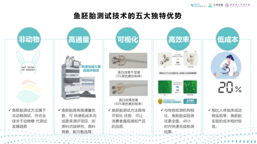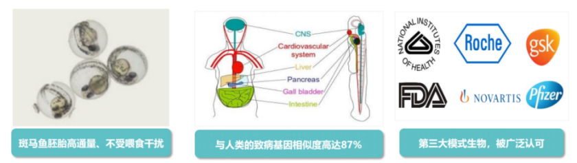 斑马鱼胚胎与人类致病基因的相似度高达87%,被美国国立卫生院被列为继大鼠小鼠之后的第三大模式生物,其生理、发育代谢与哺乳类动物高度相似,拥有与人类相同的器官,且功能相同,生理反应高度一致。因此斑马鱼胚胎功效测试可应用于美妆、功能性食品、母婴等多个行业。