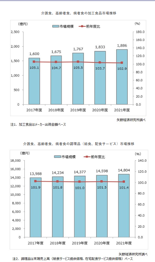 如今在日本,针对老年人的食品可以系统地分为流质饮食、软食、营养辅食、补水辅食、调稠/凝固辅食、低蛋白饮食、设施用冷冻无骨鱼7个品类,2021年整体市场规模达到16690亿日元,当中加工食品规模达到1886亿日元,熟食(家庭、医院、福祉设等的送餐服务)的规模则高达14804亿日元。