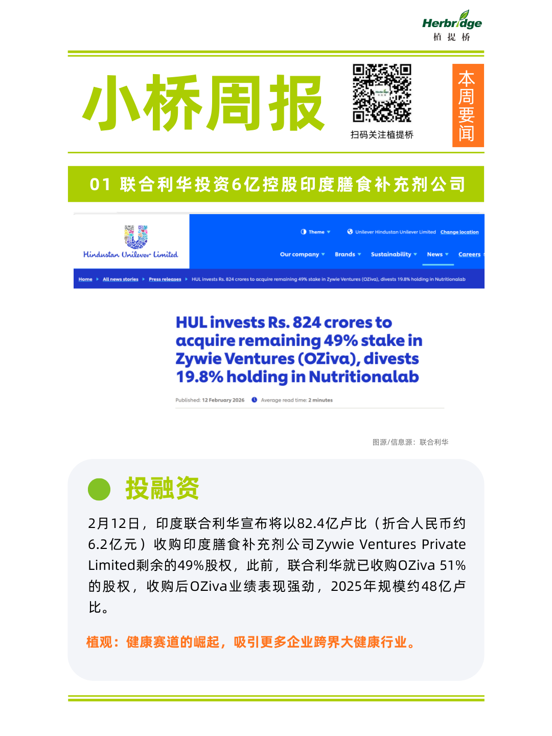 1、联合利华投资6亿控股印度膳食补充剂公司