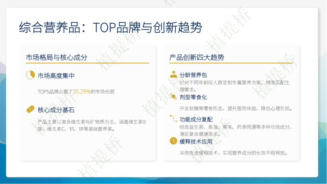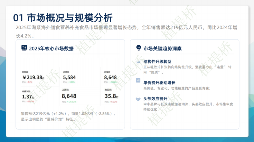 "植提桥摘要:植提桥发布2025年淘系海外膳食补剂洞察:市场销售额增、销量降,进入提质减量阶段。Swisse等国际品牌主导,心血管、骨关节为支柱,抗衰老成高增赛道,综合营养品增速放缓。"