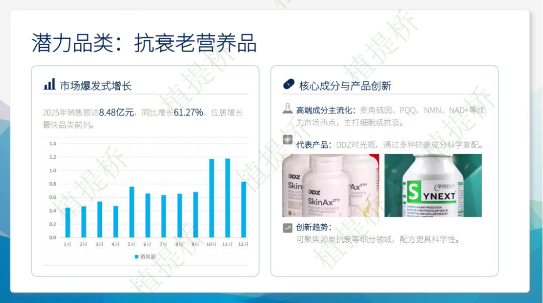 抗衰老营养品是增长最快的潜力品类,麦角硫因、PQQ等高端成分成为市场热点。产品创新不仅体现在成分上,更体现在针对特定人群和特定抗衰需求的精准配方上。