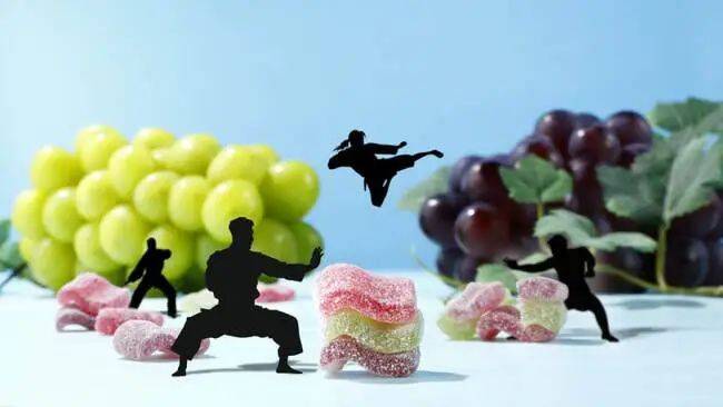 今年1月发售的”武道达人软糖“(カンデミーナグミぶどうの達人),则将软糖做成了瓦片状,可片片叠放食用,叠放层数不同,口感也会发生变化,可以挑战最多能叠放多少层,成为了社交媒体软件上的热门话题。